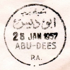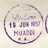 PM ID: 952 referencesSingle circle with semi-circle inset, bilingual: name in Arabic and English, date in English. Large circle, with English name touching circle.