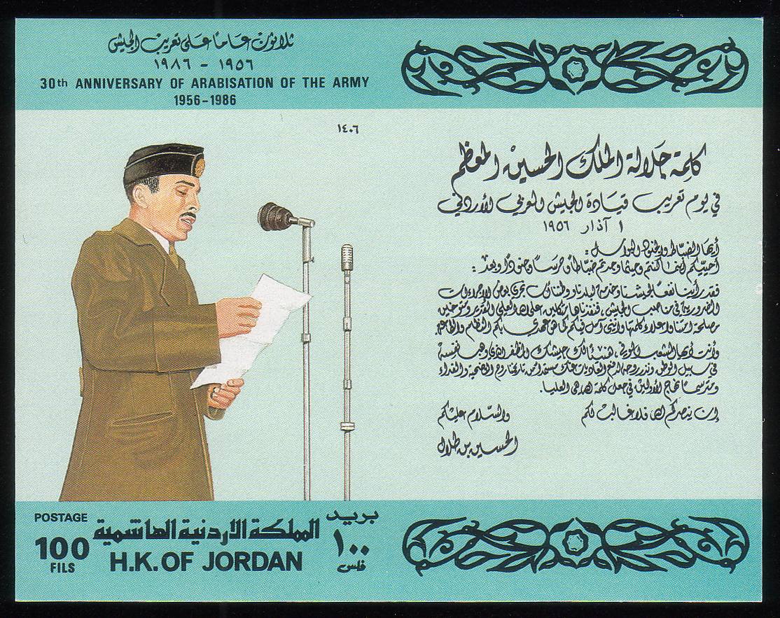 Text and King Hussein addressing army |