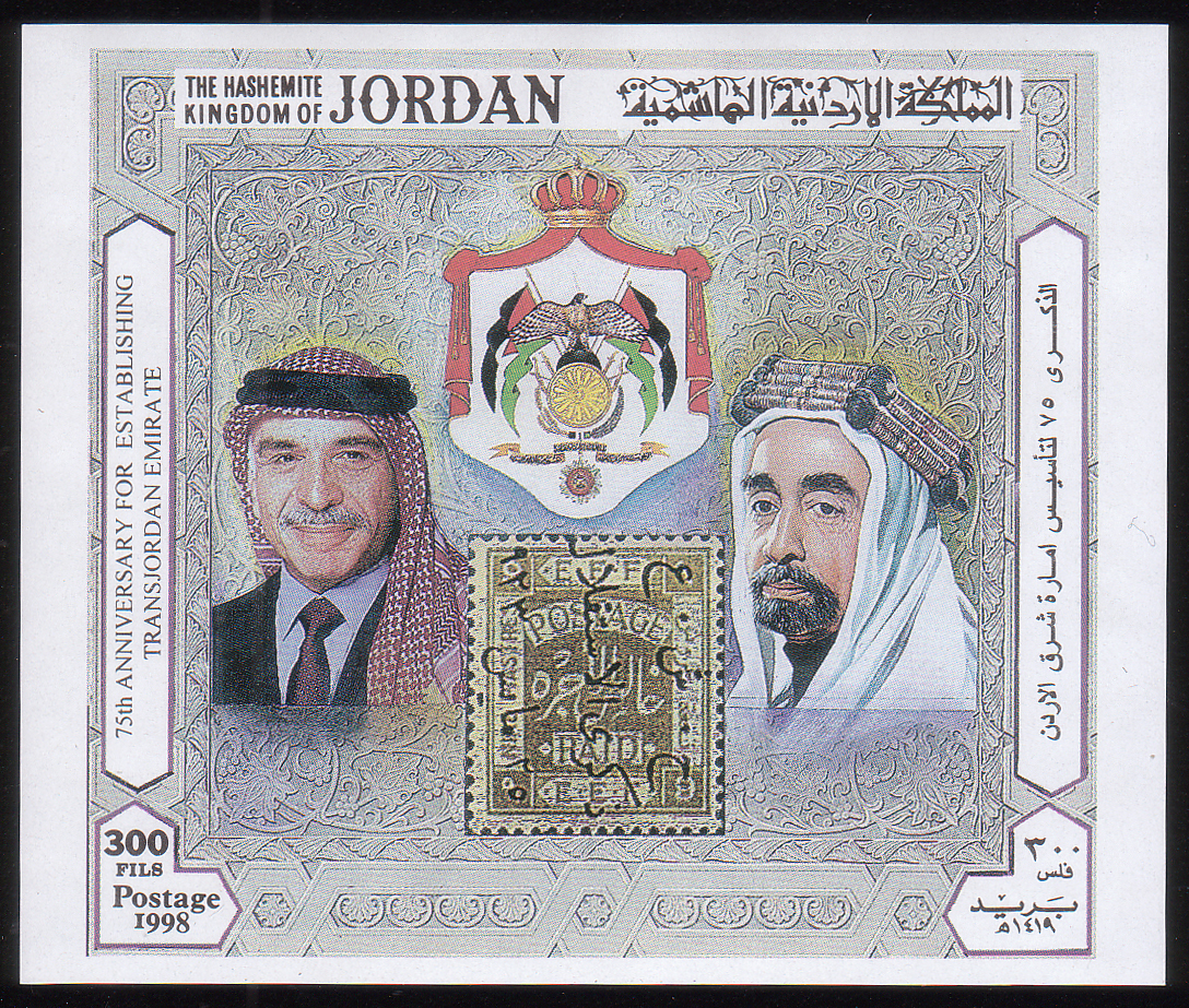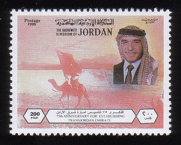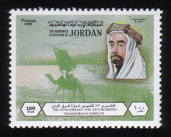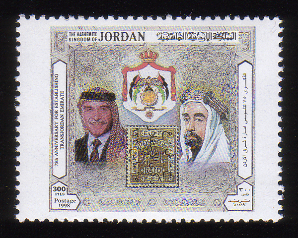 King Abdullah, King Hussein, and 5/25/1923 9p stamp (SG #106B) |